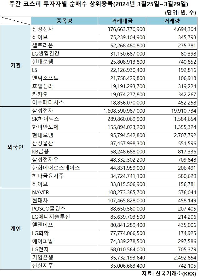기관 '삼성전자'·외인 '삼성전자'·개인 'NAVER' 1위 [주간 코스피 순매수- 3월25일~3월29일]
