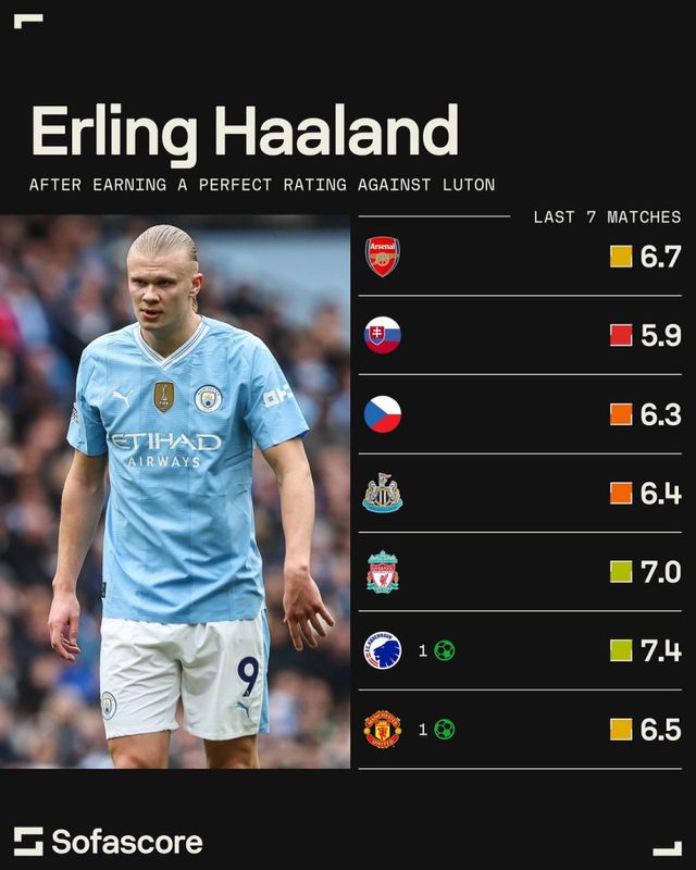 실제로 홀란의 최근 공식전 7경기 성적은 단 2골로 다소 부진하다. 그는 바로 전인 루턴 타운과의 경기에서 5골을 넣었는데, 이후엔 경기 영향력이 감소한 모양새다.