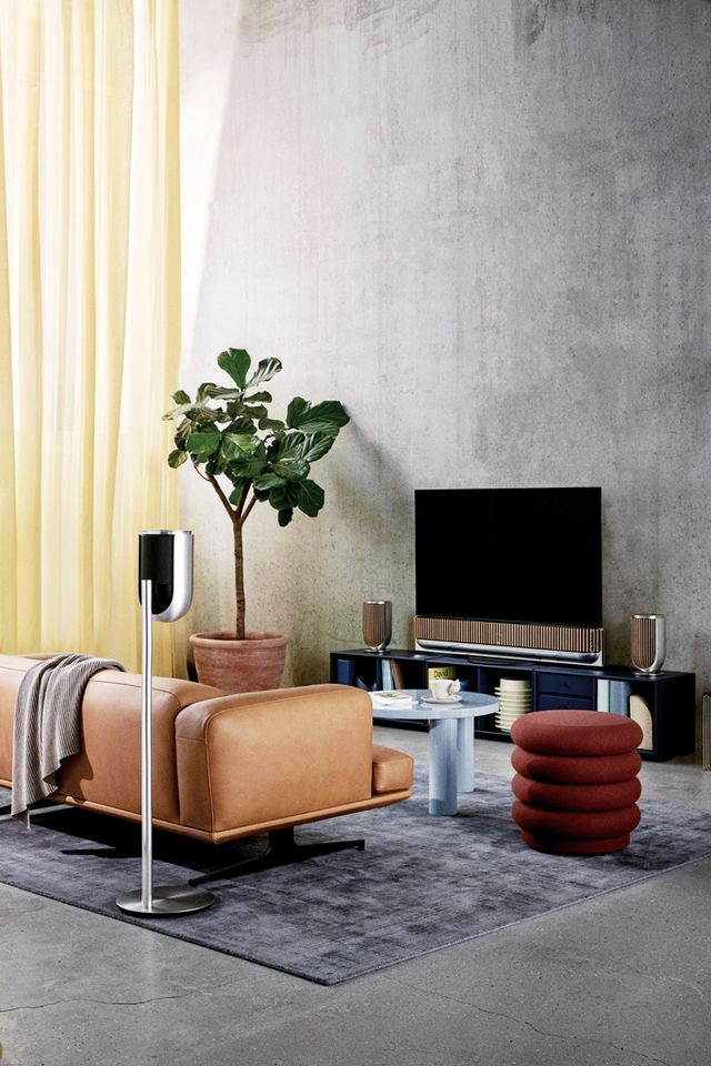 모던한 인테리어와 잘 어울리는 베오랩 8. 벽 브래킷 옵션을 활용해 연출했다.