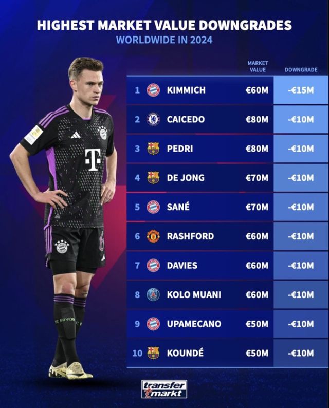 뮌헨의 요슈아 키미히가 이 부문 1위에 오르는 불명예를 안았다. 키미히의 몸값은 최근 1500만 유로(218억원) 하락, 현재 6000만 유로(872억원)다. 시장 가치의 5분의 1이나 급락한 것이다.