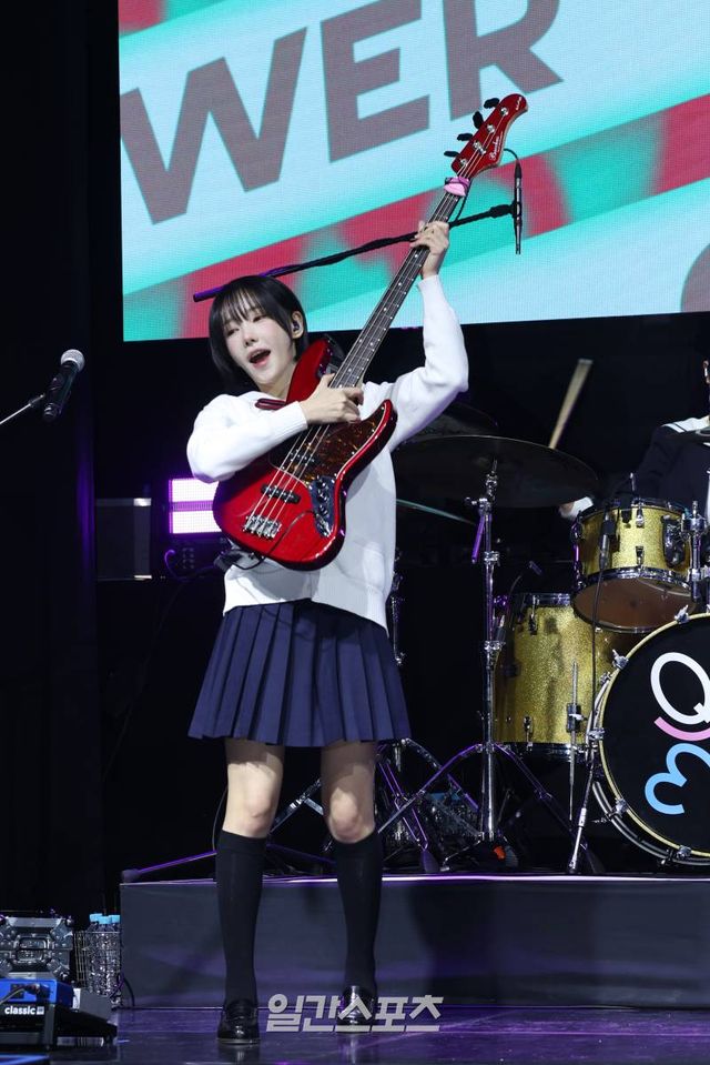 걸밴드 QWER 쵸단이 1일 오전 서울 서대문구 예스24 원더로크홀에서 열린 미니 1집 '마니또(MANITO)' 발매 기념 쇼케이스에 참석해 타이틀곡 무대를 선보이고 있다. 타이틀곡 '고민중독'은 동경하는 상대와 가까워지기 위해 고민하는 화자의 마음을 경쾌한 밴드 사운드로 풀어낸 곡이다. 서병수 기자 qudtn@edaily.co.kr /2024.04.01/