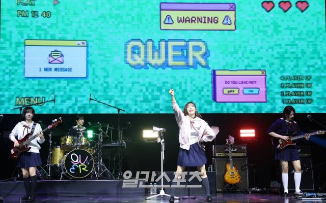 걸밴드 QWER 쵸단, 마젠타, 히나, 시연이 1일 오전 서울 서대문구 예스24 원더로크홀에서 열린 미니 1집 '마니또(MANITO)' 발매 기념 쇼케이스에 참석해 타이틀곡 무대를 선보이고 있다. 타이틀곡 '고민중독'은 동경하는 상대와 가까워지기 위해 고민하는 화자의 마음을 경쾌한 밴드 사운드로 풀어낸 곡이다. 서병수 기자 qudtn@edaily.co.kr /2024.04.01/