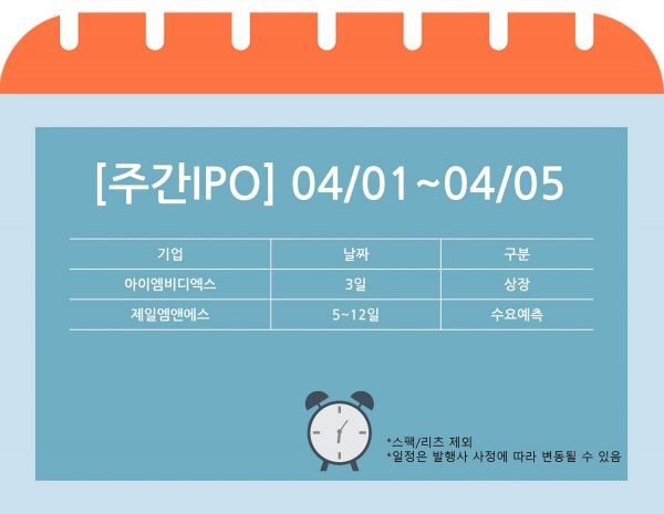 [더스탁=김효진 기자] 2분기가 시작되는 이번 주에는 아이엠비디엑스가 코스닥에 상장한다. 아이엠비디엑스는 공모가를 밴드 최상단 보다 31% 높게 확정했으며 일반청약에서 10조원 이상의 청약증거금을 끌어들였다. 2차전지 제조공정 장비 전문기업인 제일엠엔에스는 수요예측을 개시해 기관 투심 확인에 나설 예정이다.