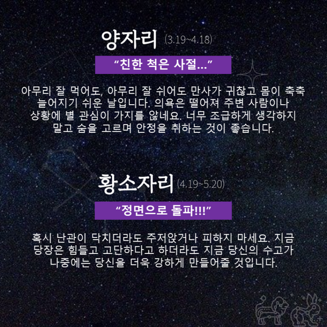 아무리 잘 먹어도, 아무리 잘 쉬어도 만사가 귀찮고 몸이 축축 늘어지기 쉬운 날입니다. 의욕은 떨어져 주변 사람이나 상황에 별 관심이 가지를 않네요. 너무 조급하게 생각하지 말고 숨을 고르며 안정을 취하는 것이 좋습니다.