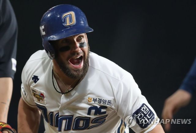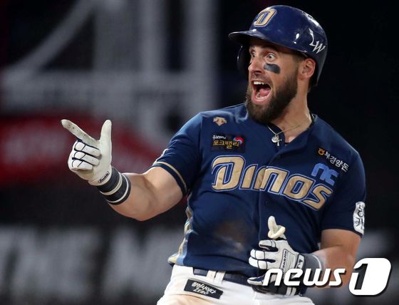 닉 마티니가 2022년 8월 7일 부산 동래구 사직야구장에서 열린 프로야구 '2022 신한은행 SOL KBO리그' NC 다이노스와 롯데 자이언츠의 경기에서 7회초 1사 만루 NC 마티니의 4타점 홈런 후 홈인하여 세레머니를 하고 있다. / 뉴스1
