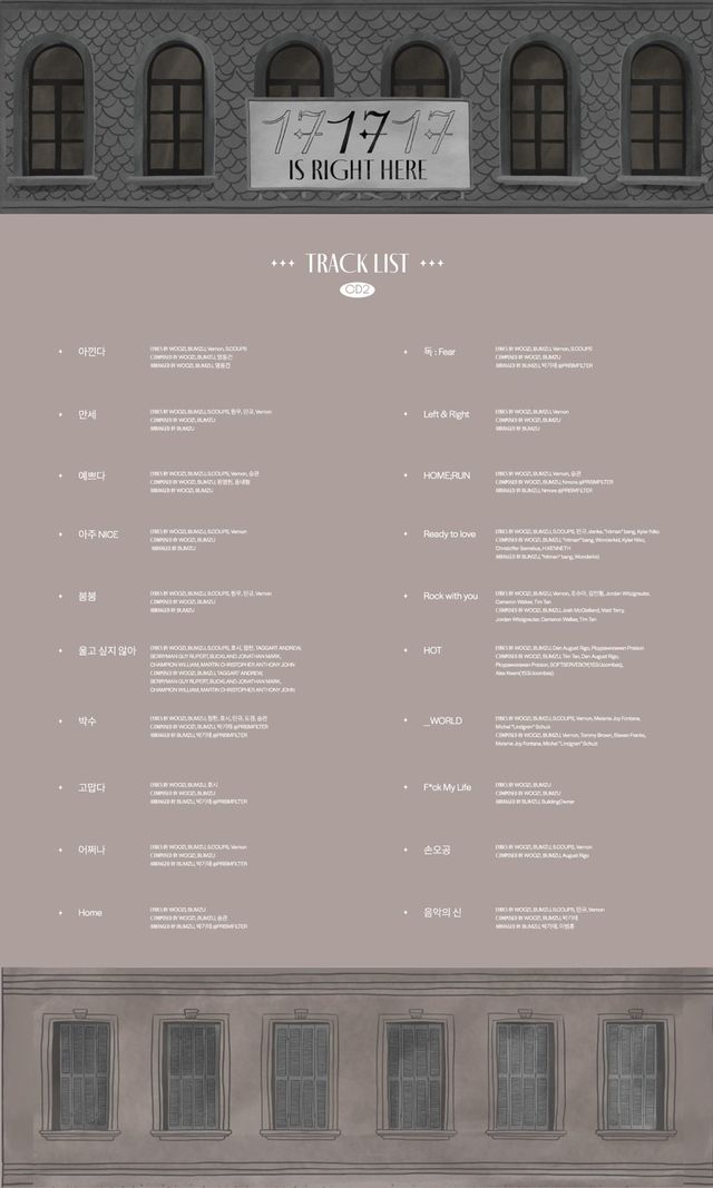 CD2에는 한국 앨범 타이틀곡 20곡이 수록됐다. 데뷔 곡 ‘아낀다’부터 ‘만세’, ‘예쁘다’, ‘아주 NICE’, ‘붐붐’, ‘울고 싶지 않아’, ‘박수’, ‘고맙다’, ‘어쩌나’, ‘Home’, ‘독 : Fear’, ‘Left & Right’, ‘HOME;RUN’, ‘Ready to love’, ‘Rock with you’, ‘HOT’, ‘_WORLD’, ‘F*ck My Life’, ‘손오공’, ‘음악의 신’까지 세븐틴의 모든 순간이 담겨 뜻깊은 앨범이 될 것으로 기대를 모은다.