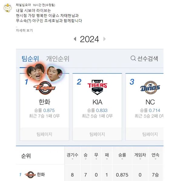 공개된 사진에는 2024시즌 KBO리그 현재 순위표와 함께 차태현, 조세호의 얼굴이 담겨 있었다.