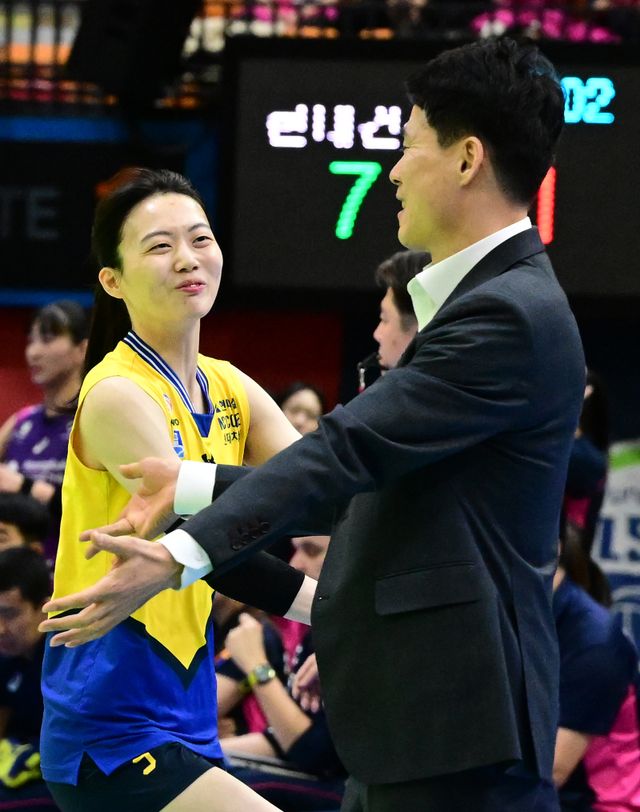 강성형(오른쪽) 현대건설 감독과 웃고 있는 김다인. 사진=KOVO