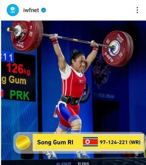 북한 역도선수 리성금(26)이 국제역도연맹(IWF) 월드컵에서 합계 세계 신기록을 세우며 정상에 올랐다. 리성금은 2일(한국시간) 태국 푸껫에서 열린 여자 49kg급에서 인상 97kg, 용상 124kg, 합계 221kg을 들어올렸다. 합계 221kg은 리성금이 지난해 9월 항저우 아시안게임에서 금메달을 딸 때 작성한 자신의 종전 세계 기록 216kg을 5kg 넘어선 세계 신기록이다. 2위는 도쿄올림픽 금메달리스트 허우즈후이(27·중국)이 합계 217kg(인상 97kg·용상 120kg)를 들어올렸고, 장후이화(26·중국)는 합계 208kg(인상 94kg·용상 114kg)으로 3위를 했다. 북한은 이번 대회에서 여자 45kg급에서 우승한 원효심(21)에 이어 남자 55kg급에서도 방은철(23)이 인상 118kg, 용상 152kg, 합계 270kg으로 정상에 올라 남녀 3개 체급 경기서 금메달을 수확했다.