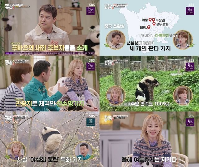 팬들의 최대 관심사, 푸바오가 검역 이후 여생을 보내게 될 곳에 대해서는 강 사육사는 “검역을 받는 곳은 정해졌지만, 그곳이 푸바오가 정착지가 될지는 아직은 확실한 것은 아니다”라며 중국의 판다 기지 후보들을 미리 둘러보는 시간을 가졌다. 쓰촨성에 위치한 후보지는 셋. 먼저 워룽 선슈핑 기지는 산자락에 위치해 비교적 시원한 기후를 가져 더위를 싫어하는 판다들에게는 좋은 곳이고, 자연 속에 스며들어 살아갈 수 있도록 하는 야생화 훈련 특화 기지이면서도, 접근성 면에서도 다른 곳보다 나아 관광지로 제격이라 했다. 그 말을 들은 산다라박은 “올해 여름휴가는 저기다”라며 푸덕다운 모습을 드러냈다.