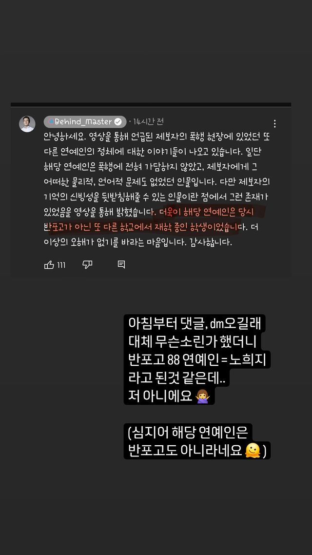 이진호는 "더욱이 해당 연예인은 당시 반포고가 아닌 또 다른 학교에서 재학 중인 학생이었다"고 했는데, 이에 노희지는 "심지어 해당 연예인은 반포고도 아니라네요"라고 덧붙이며 황당해했다.
