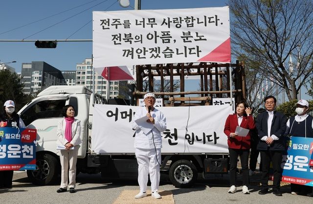 정 후보는 "함거(죄인을 실어나르는 수레)에 들어간 지 7일이 됐다"며 "전주 시민이 느낀 윤석열 정부에 대한 분노에 대해 많은 생각을 했다"고 말했다.