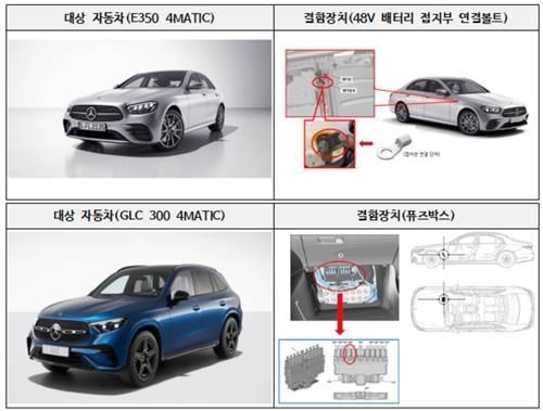 벤츠 E350 4MATIC 등 8개 차종 2만7406대는 48V 배터리 접지부의 연결 볼트 고정 불량으로, GLC 300 4MATIC 등 31개 차종 8833대는 퓨즈박스 내 설치된 퓨즈 제조 불량으로 모두 오는 5일부터 시정조치를 한다.