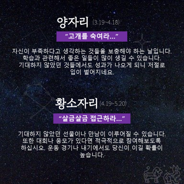 커플인 분의 경우 아무런 문제가 없는데도 괜스레 멀게 느껴질 수 있습니다. 쓸데없는 농담보다는 진지한 대화가 두 사람 사이를 묶어줄 것입니다. 싱글인 분의 경우에는 자신과 어느 정도 나이차가 있는 상대를 골라보면 좋겠네요.
