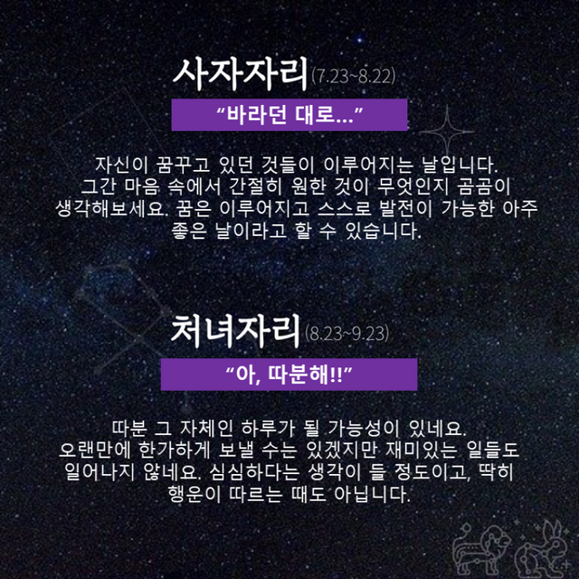 자신이 꿈꾸고 있던 것들이 이루어지는 날입니다. 그간 마음 속에서 간절히 원한 것이 무엇인지 곰곰이 생각해보세요. 꿈은 이루어지고 스스로 발전이 가능한 아주 좋은 날이라고 할 수 있습니다.