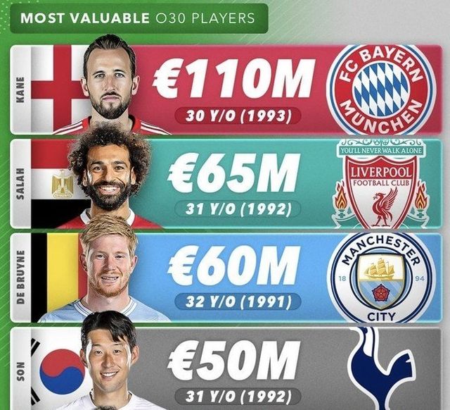 1993년생이라 올해로 31세가 됐음에도 세계 최고의 공격수 중 한 명인 케인은 30대 선수들 중 가장 몸값이 높은 선수로 조사됐다.