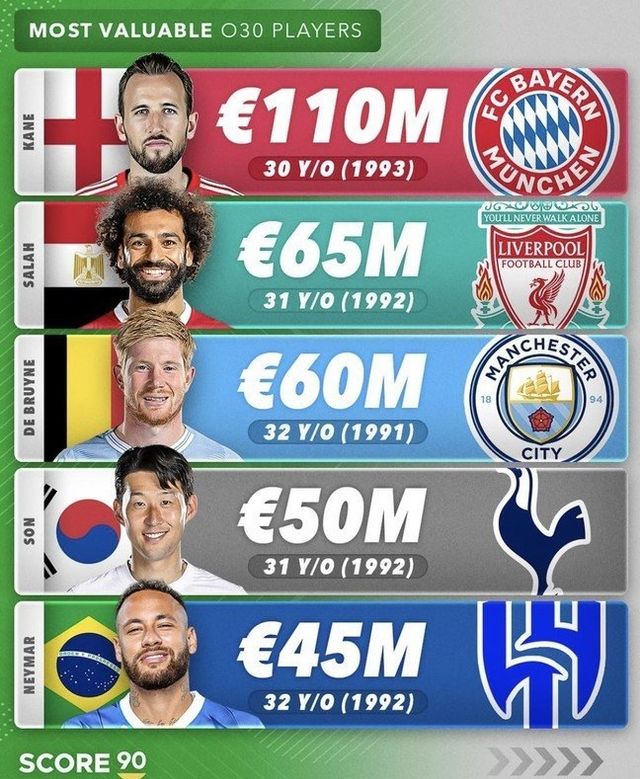 한편, 몸값이 가장 높은 30대 선수 상위 5인을 조사한 자료에서 전설적인 축구선수 리오넬 메시(인터 마이애미)와 크리스티아누 호날두(알 나스르)가 빠지면서 한 시대를 풍미했던 두 레전드가 이제 은퇴가 머지 않았음을 느끼게 해줬다.
