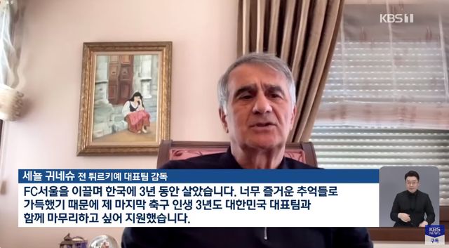 KBS는 지난 4일 세뇰 귀네슈 전 튀르키예 축구대표팀 감독과 진행한 화상 인터뷰를 공개했다. 세뇰 귀네슈 감독은 2002년 한일월드컵에서 튀르키예를 3위까지 끌어 올린 명장으로 꼽힌다. 지난 2007년부터 세 시즌 동안 FC서울을 이끌기도 했다. 2013년부터 한국 축구대표팀 감독 선임 때마다 꾸준히 하마평에 오르기도 했다.