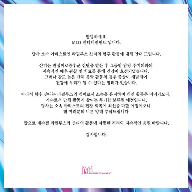 라필루스 소속사 MLD엔터테인먼트는 5일 공식 입장을 통해 샨티의 건강 상태와 향후 활동 방향에 대해 알렸다.