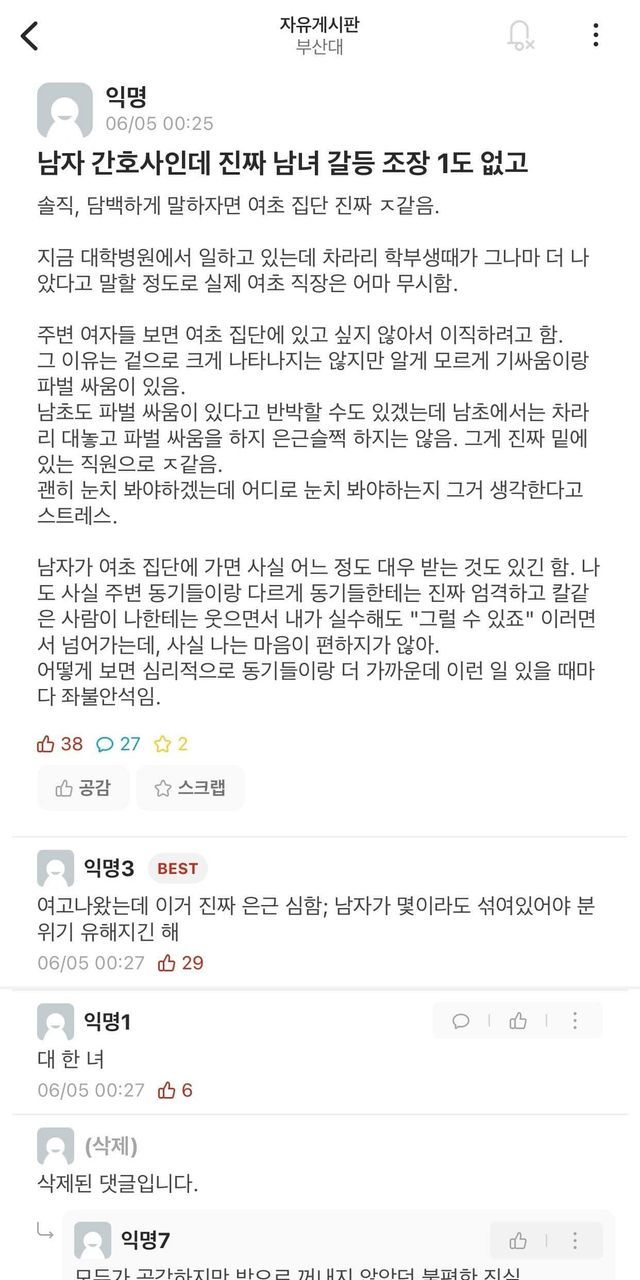 여초 직장이 너무 힘들다는 부산대 에타 간호사
