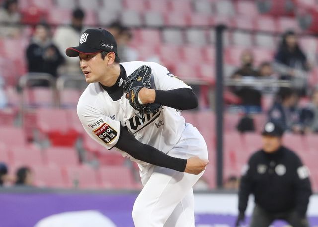 지난달 27일 오후 경기 수원시 장안구 KT위즈파크에서 열린 '2024 신한 SOL 뱅크 KBO리그' 두산 베어스와 kt 위즈의 경기에서 1회 초 KT 선발투수 고영표가 공을 던지고 있다. / 뉴스1