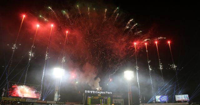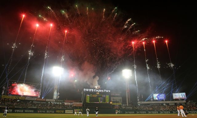 지난달 29일 대전 중구 한화생명 이글스파크에서 열린 '2024 신한 SOL 뱅크 KBO리그' kt 위즈와 한화 이글스 경기에서 개막 축하 불꽃놀이가 펼쳐지고 있다. / 뉴스1