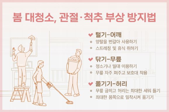 털고, 닦고, 들어 옮기는 과정에서 어깨, 무릎, 허리 등에 무리가 올 수 있다. 관절과 척추 등 뼈 부담을 줄여야 한다.