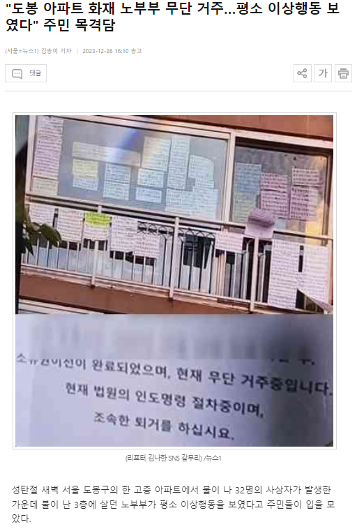 이어 "그런데 평소에 좀 이상한 행동을 보였다고 한다. 베란다 바깥으로 물을 막 버리는가 하면 알 수 없는 내용의 쪽지를 베란다에 붙여놨다고 한다. 더군다나 최근에 경매가 진행이 돼서 그 앞에 쪽지가 붙어있었고 집을 나가야 하는 상황이었다고 한다. 그러다 보니 단순 불이 아닌 다른 이유로 불이 난 게 아니냐 하는 의심을 하고 있는 상황"이라고 덧붙였다.