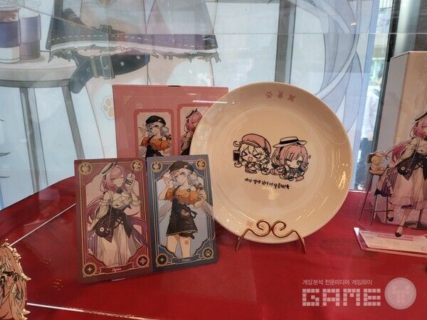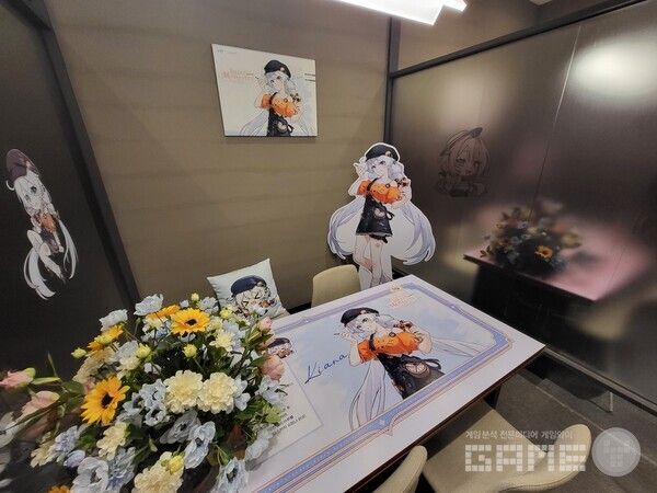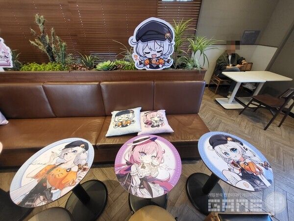 어느정도 음식을 맛보고 매장을 둘러보기 시작했는데, 1층에는 캐릭터 배경으로 사진을 찍을 수 있는 포토부스가 준비되어 있었다. 2층에는 ‘붕괴3rd’ 캐릭터들이 그려진 아크릴 굿즈들이 놓여진 테이블과 쿠션을 시작으로 키아나의 아크릴 등신대가 놓여진 포토존을 만나볼 수 있었다.