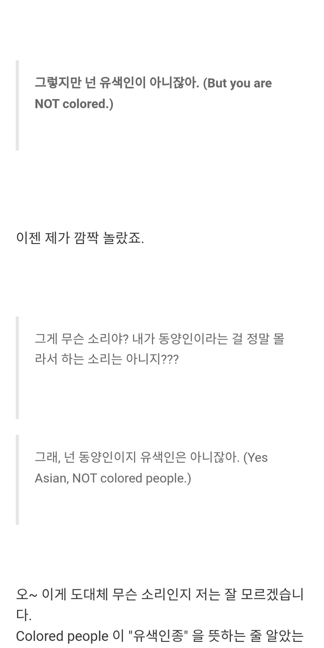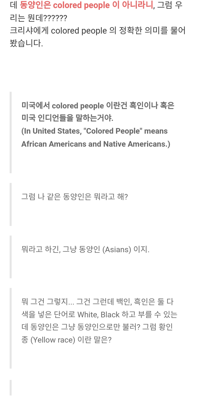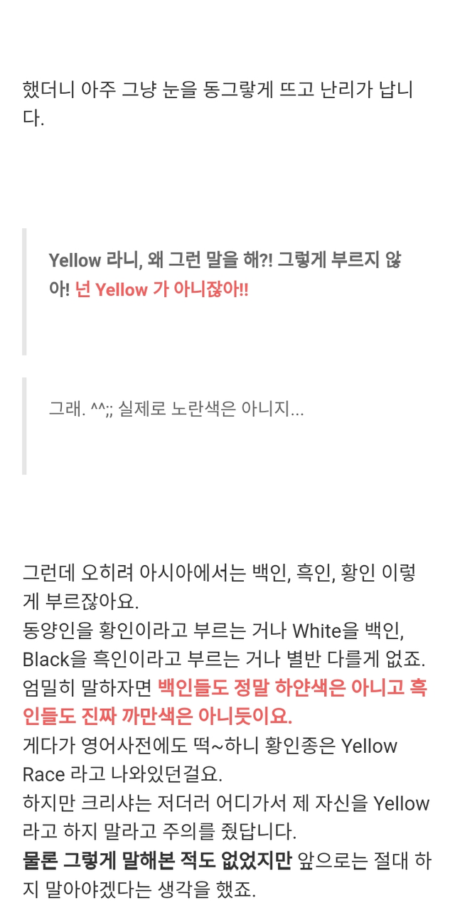 한국에서 하던 것처럼 서양에서 황인(Yellow)이라는 용어를 썼다가는 이상한 사람 취급 받을 수 있으니 조심하자