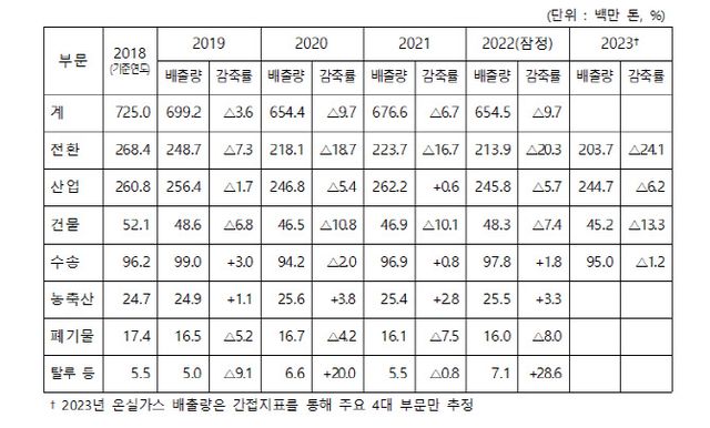 정부에 따르면, 지난 2022년 국가 온실가스 배출량(잠정치)은 전년 대비 2210만톤 감소한 6억5400만 톤으로 지난 2010년 6억5510만 톤 이후 가장 낮은 수치로, 2023년 주요 4대 부문(전환, 산업, 건물, 수송)에서 전년 대비 약 1727만 톤의 온실가스 배출량이 추가로 감축될 것으로 예상된다.