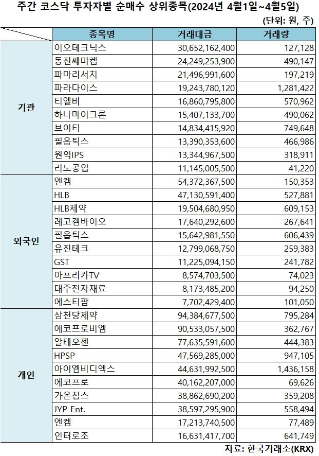 기관 '이오테크닉스'·외인 '엔켐'·개인 '삼천당제약' 1위 [주간 코스닥 순매수- 4월1일~4월5일]