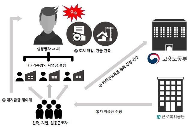 [이데일리 서대웅 기자] 한 인테리어 업체 실소유주인 A씨는 가족 명의로 여러개 사업장을 설립한 후 가족과 지인에게 허위로 임금체불 진정서를 정부에 내도록 했다. 그는 가족과 지인 등을 근로자로 둔갑해 69명이 총 15차례에 걸쳐 ‘간이대지급금’을 신청, 총 11억3500만원을 부정수급했다. 이중 9억3500만원을 본인과 가족 명의 통장으로 옮겨 토지를 매입하고 건물을 지었다. 고용노동부는 A씨를 구속기소했다.