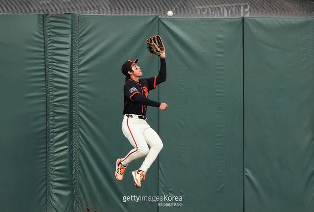 타석에선 아쉬움을 남긴 이정후지만, 수비에선 강렬한 인상을 남겼다. 5회 초 1사 주자 없는 상황에서 잭슨 메릴의 타구가 가운데 외야 워닝트랙까지 뻗었고, 이정후가 끝까지 추격한 뒤 몸을 날려 잡아냈다. 비거리그 394피트(120m)에 이르는 장타였지만, 이정후가 넓은 수비 범위를 보여줬다.