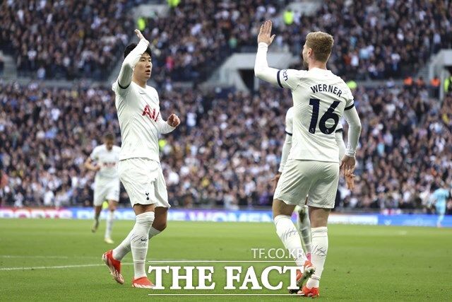 토트넘의 4위탈환을 이끈 손흥민(왼쪽)이 8일 노팅엄 포레스트전에서 전반 15분 상대 자책골을 끌어낸 베르너와 하이파이브를 하고 있다./런던=AP.뉴시스