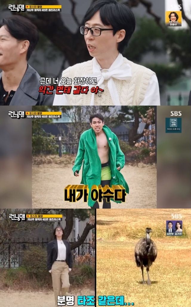 이날 방송은 ‘런닝맨’의 시그니처인 ‘연령 고지에 봄이 왔나봐’ 레이스로 꾸며져 기대감을 더했다. 본격 레이스에 앞서 새 포스터 촬영이 진행됐고, 지난주 레이스였던 ‘힙이 차오른다’ 벌칙자들인 유재석, 김종국, 하하, 양세찬의 충격적인 ‘팬츠리스’ 룩이 공개됐다. 특히, 양세찬은 뜻밖의 야성미를 뽐내 폭소를 자아냈다.