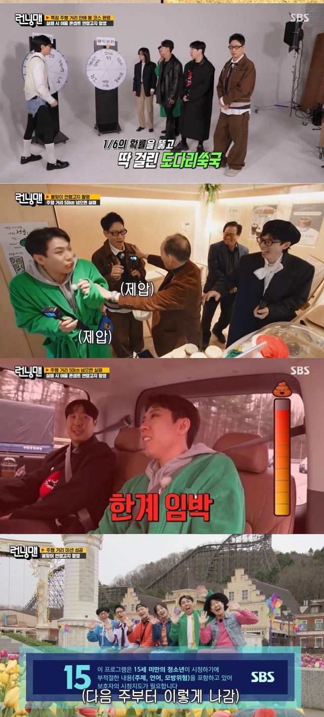 이후 멤버들은 제한된 주행거리 내에 봄의 먹거리와 장소를 담아야 하는 미션에 도전했다. 도다리쑥국으로 ‘봄 먹방’에 도전한 멤버들은 이어 경기도의 한 놀이공원으로 향했다. 하지만 이 과정에서 양세찬의 ‘급똥’이 찾아왔고, 고통스러운 모습을 보였다. 반면 유재석은 “아직 급한 거 아니다”라며 미션에 몰입하는 모습을 보였고, 양세찬은 끝내 “차 세워라”라며 하극상을 감행해 웃음을 자아냈다.