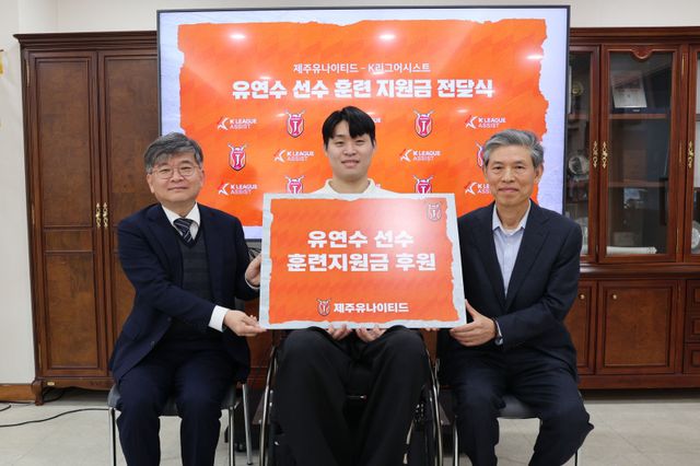 프로축구 제주 유나이티드가 패럴림픽 출전을 목표로 도전하는 유연수에게 훈련 지원금을 전달했다.