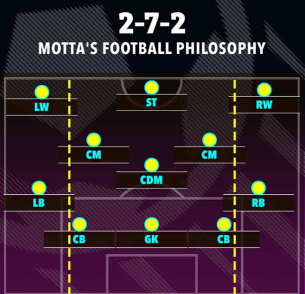 더선은 "모타는 지난 2018년 파리 생제르맹 유스팀 감독 시절 2-7-2 포메이션을 공개해 전 세계를 깜짝 놀라게 했다. 특히 모타는 골키퍼를 미드필더로 취급한다. 이 포메이션은 이론상 매우 극단적이다"라며 "수비에서부터 공격으로 읽는 게 아니라 왼쪽에서 오른쪽으로 읽는다. 엄밀히 따지면 전통적인 4-3-3 또는 4-2-3-1과 유사하다"라고 전했다.
