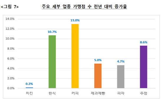 업종별로 보면 브랜드 수 증가는 외식(5.2%) 및 서비스 업종(5.7%)이 주도했으며 가맹점 수 증가는 외식업종(7.4%)에서 두드러진 것으로 나타났다. 업종별 브랜드 수 비중은 외식(79.9%), 서비스(15.3%), 도소매(4.8%) 순이며, 가맹점 수 비중 역시 외식(51.0%), 서비스(29.5%), 도소매(19.5%) 순으로 집계됐다.