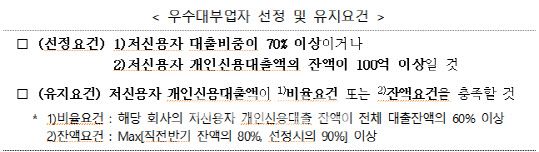 그런데 현재 제도는 저신용자 대출 노력을 지속하는 우수 대부업자라도 유지 요건에 약간 못 미친다는 이유로 일률적으로 선정이 취소될 수 있었다. 예를 들어 저신용자 개인 신용 대출 잔액이 선정 시점 대비 90% 이상을 유지하지 못하고 75~90% 정도로만 떨어져도 선정이 취소되는 식이다.