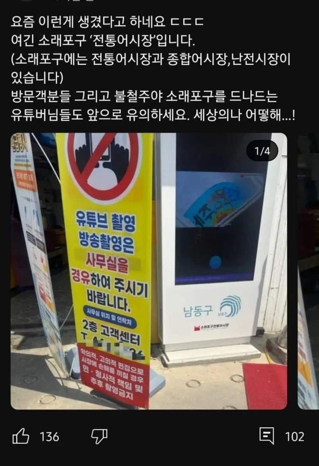 입간판 사진을 공유한 게시자는 "소래포구에는 전통어시장, 종합어시장, 난전시장이 있다. 여긴 소래포구 전통어시장이다”라면서 "방문객과 소래포구를 드나드는 유튜버들은 주의하라"고 당부했다.