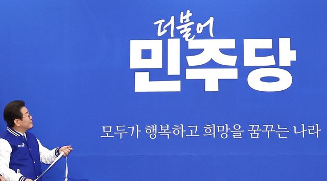 더불어민주당 자료 사진. 이재명 민주당 대표가 서울 여의도 국회에서 열린 새 PI 선포식에서 당의 새 로고와 상징을 공개하고 있다. / 뉴스1