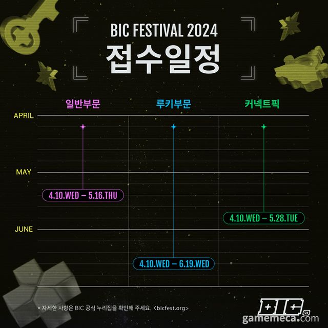이번 접수는 경쟁부분인 ▲일반부문 ▲루키부문과 비경쟁 부문인 ▲커넥트픽까지 총 3개 부문에서 한다. 일반부문은 4월 10일부터 5월 16일까지 접수 가능하며, 학생이나 25세 이하 미취업자를 위한 루키부문은 4월 10일부터 6월 19일까지다. 또, 빅커넥터즈(BIC 공식 인디게임 팬덤) 투표로 선정되는 비경쟁 부문인 커넥트픽은 4월 10일부터 5월 28일까지 받는다.