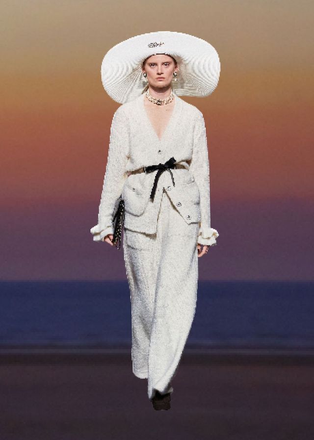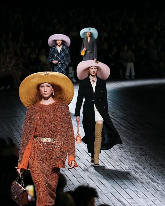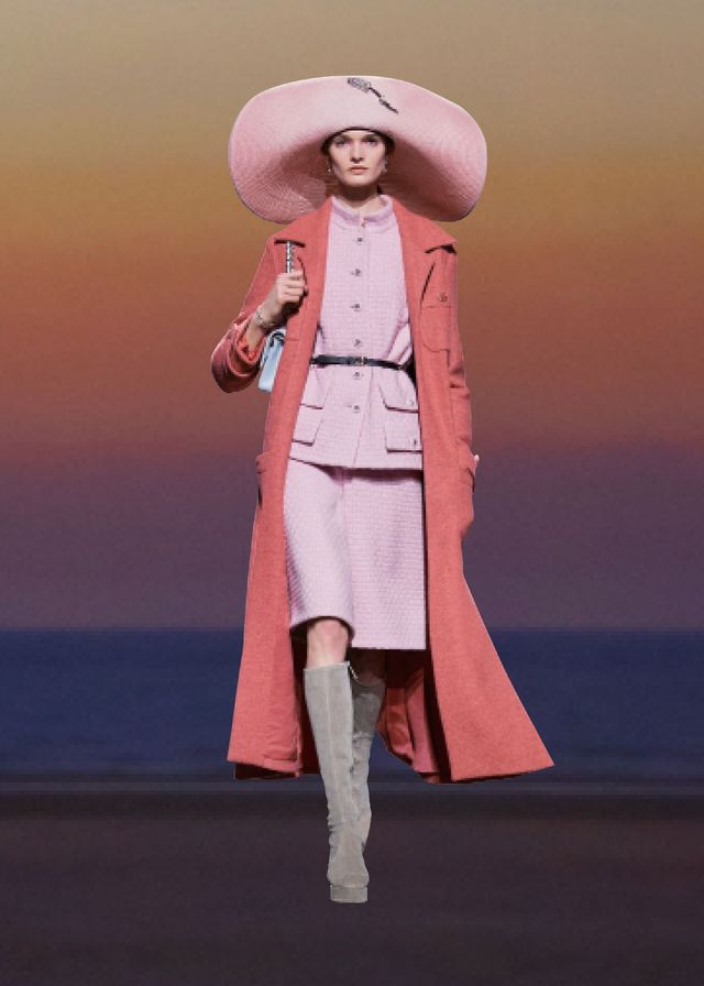 연인이 서로 마주 보고 눈을 깜박일 때 ‘다바다바답 다바다바답’ 하고 BGM이 깔리던 로맨스 장면을 기억하는지. 수많은 패러디 장면을 낳은 영화 〈남과 여〉를 이번엔 이네즈 & 비누드가 감각적으로 재해석해 샤넬 2024 F/W 쇼가 진행되기 전 프롤로그처럼 상영했다. 해변에서 나부끼는 바람을 만끽하며 로맨틱하고 유머러스한 연기를 펼치는 브래드 피트와 페넬로페 크루즈의 모습을 흑백필름으로 담은 것. 쇼가 시작되자 흑백에서 컬러로 장면이 전환하듯 영화에 카메오로 출연한 모델 리앤 반 롬페이가 커다란 핑크 브림 햇을 쓰고 런웨이를 걸어 나왔다.