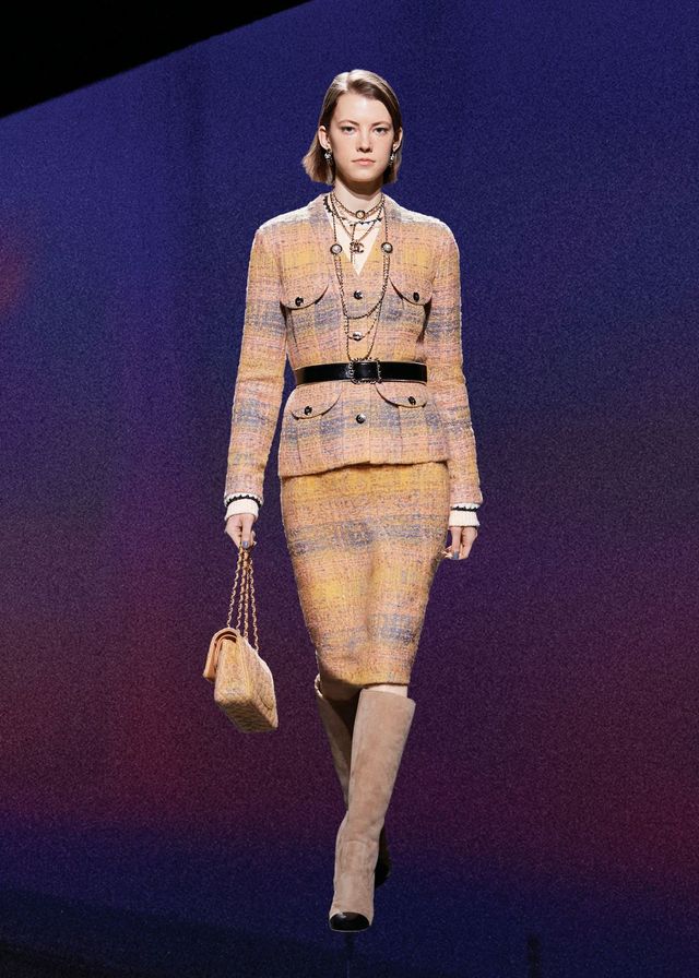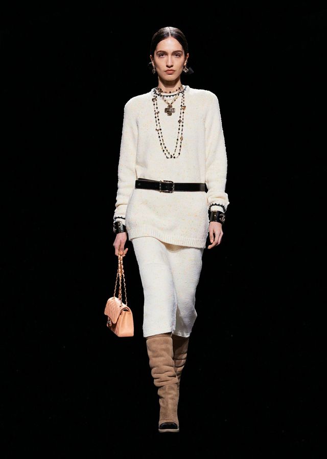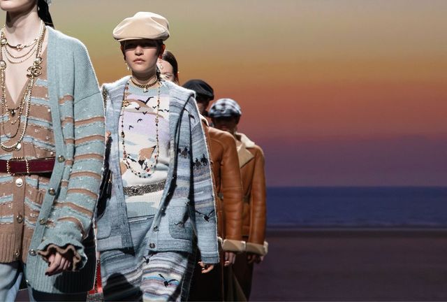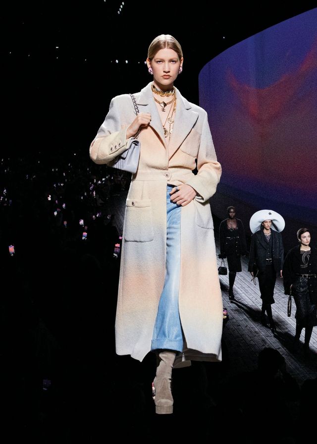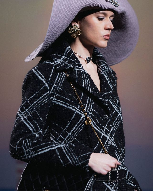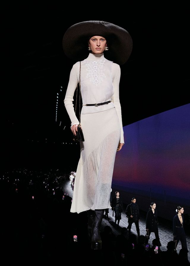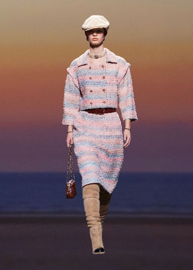 영화 속 아누크 에메의 룩을 연상시키는 시프스킨 소재의 재킷과 부츠를 직접적으로 연출하는가 하면, 겨울 바다의 오묘한 하늘빛을 닮은 파스텔컬러 룩이 널빤지로 만든 산책로 레 플랑슈(Les Planches) 위에 펼쳐지기도 했다. 해가 지고 푸른 밤바다의 기운이 돌 땐 블랙 & 화이트 룩이 이어지며 겨울 휴양지의 차분함마저 느끼게 만들었다. 한 발 더 다가가 룩을 자세히 살펴보면 가브리엘 샤넬이 도빌의 경마장과 해변, 레스토랑 등에서 남성 룩을 보고 영감을 얻었던 아이템을 발견할 수 있었다. 어깨가 넓은 피코트, 보트넥 재킷, 세일러 스웨터, 퀼로트와 크롭트 팬츠까지 모델들이 런웨이를 산책하듯 여유롭고 우아하게 거닐 수 있었던 이유는 편안한 소재와 실루엣 덕분이었던 것. 머리를 자르고 옷에서 여성의 몸을 해방시킨 가브리엘 샤넬의 정신을 떠올리게 하는 룩들 말이다.