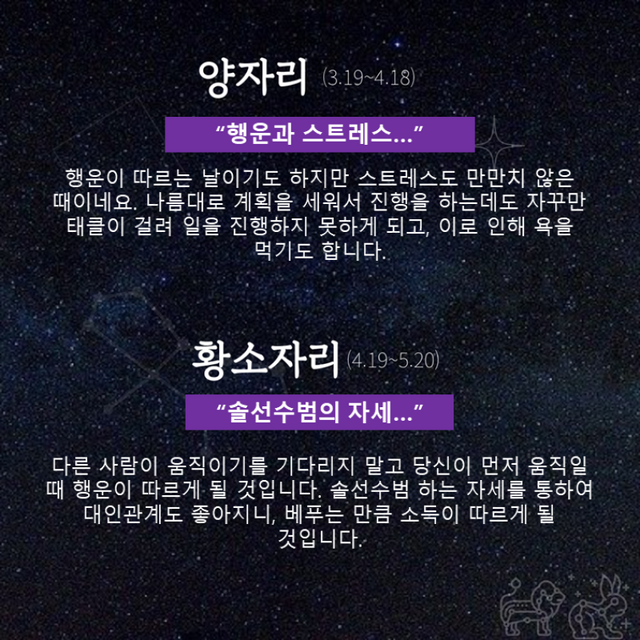 행운이 따르는 날이기도 하지만 스트레스도 만만치 않은 때이네요. 나름대로 계획을 세워서 진행을 하는데도 자꾸만 태클이 걸려 일을 진행하지 못하게 되고, 이로 인해 욕을 먹기도 합니다.