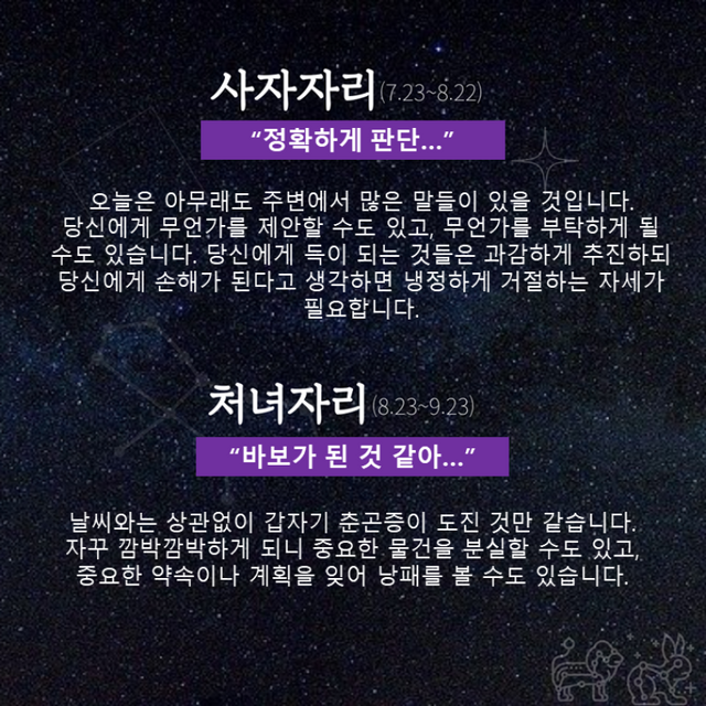 싱글인 분이라면 평범한 스타일보다는 개성이 강한 스타일과 연결될 확률이 높습니다. 사자자리와 잘 어울리는 때이니 참고하도록 하세요. 커플인 경우에는 만남을 미루는 것이 좋습니다. 너무 자주 만나는 것이 도움이 안 될 때도 있습니다.