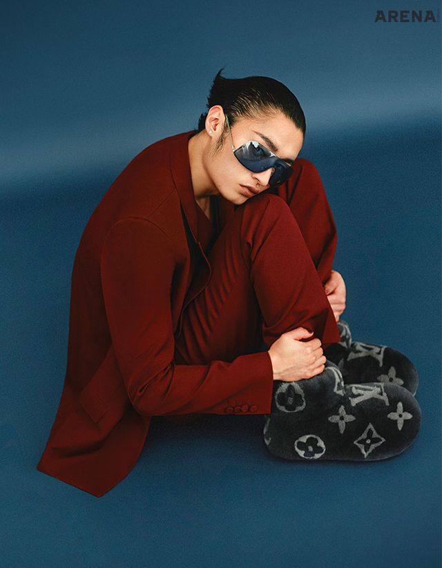 더블브레스트 재킷 가격미정·베스트 가격미정·팬츠 가격미정·블루 렌즈 선글라스 86만원 모두 구찌, 시어링 소재의로 부츠 350만원 루이 비통 제품.