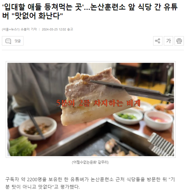 끝으로 "입소 예정이면 휴게소에서 밥을 먹고 오거나 포장해 오는 것을 추천한다. 논산 연무대 쪽 자체가 굉장히 시골이라 애초에 높은 퀄리티의 음식이나 서비스를 기대하기 어렵다"고 덧붙였다.